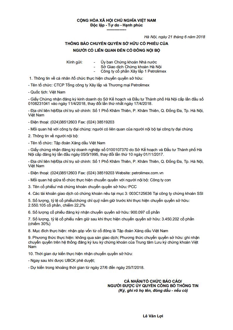 Thông báo chuyển quyền sở hữu cổ phiếu PCC của người có liên quan đến cổ đông nội bộ