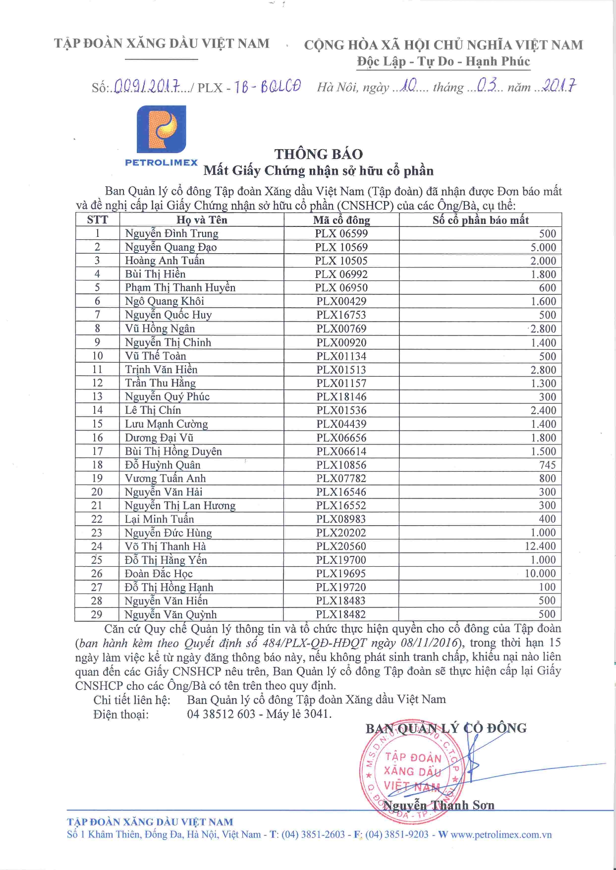 Danh sách chi tiết tạiThông báosố 009/2017/PLX-TB-BQLCĐ ngày 10.3.2017và các mẫu Đơn đề nghị cấp lại GCNSHCP & Giấy đề nghị hiệu chỉnh thông tin - để Quý vị Cổ đông thuận tiện trong tra cứu, sử dụng.