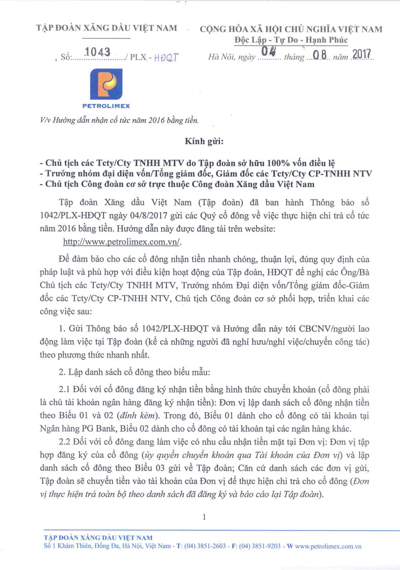 PLX hướng dẫn nhận cổ tức 2016